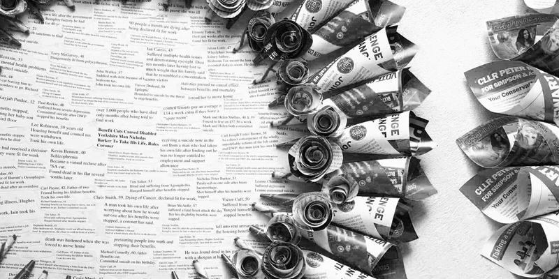 I came up with ‘The Political Is Personal’, which is currently on show in the public area of Conway Hall. The piece comprises three large wreaths, intricately constructed from paper electioneering material from four of the five major parties in England (Labour, Conservatives, The Green Party, and UKIP – I could not reach any local member of the Liberal Democrats, no matter now many times I e-mailed, rang, or tweeted them!). (Getting in touch with all the parties to collect their post-election ephemera was an interesting experience in itself, and has led to the bizarre state of affairs of me receiving e-mails from UKIP that begin ‘Dear Friend’!) The wreaths are in memorial to those who have died following the imposition of bedroom tax or as a result of having benefits revoked. The names and circumstances of some of these individuals are detailed in the centre of each wreath, a harrowing multiplicity, even if it is but a small representation, along with manifold statistics from the department of work and pensions, including the disingenuous phrase “any causal effect between benefits and mortality cannot be assumed from these statistics”. (I know correlation does not equal causation but, really?)